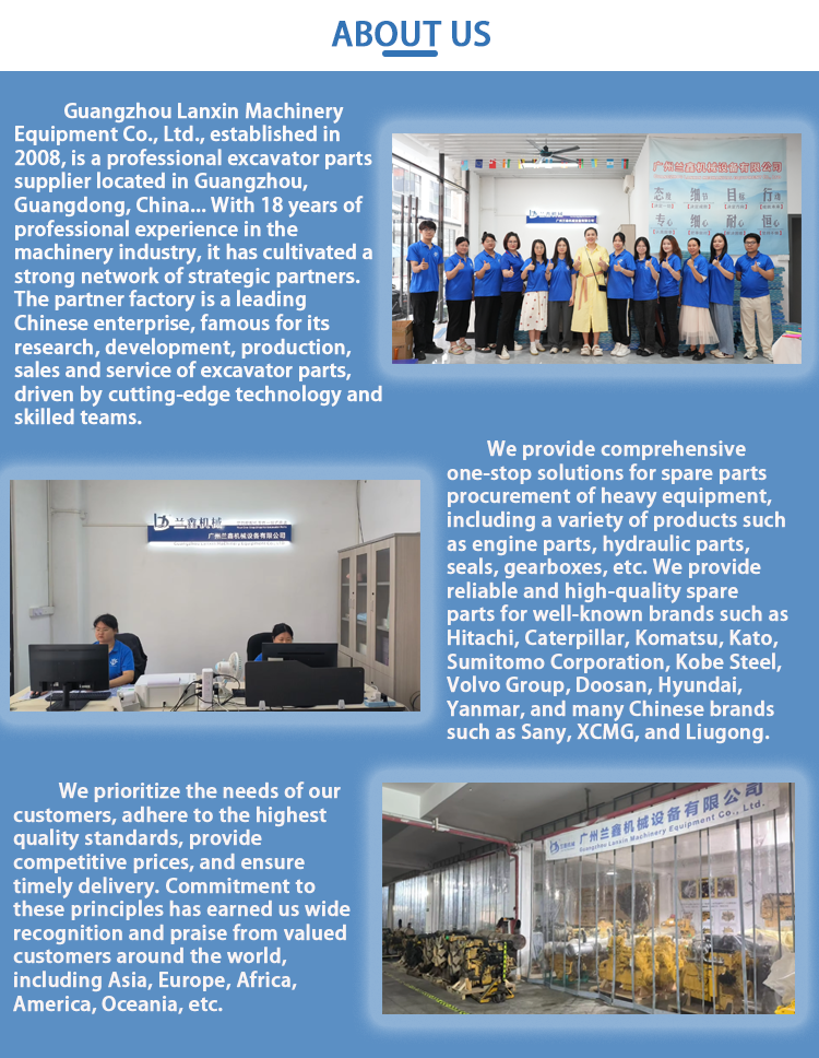 Established in 2008, Guangzhou Lanxin Machinery Equipment Co., Ltd. have over 18 years of expertise as a specialist supplier of excavator parts, focusing on engineering parts and Excavator parts such as Engine Parts,Hydraulic Parts,Seal Parts and Repair Kits,Electrical Parts,Wear Parts and Consumable Parts ,Undercarriage Parts ,Structure Parts and Boom Arm Parts,Cab Parts systems ect.We have 150 experienced professionals and a 30,000-square-meter factory area, with an annual production capacity of up to 5000 units, ensuring efficient and stable supply capabilities. We are equipped with ample inventory and fast shipping, providing a one-stop, cost-effective solution for your excavator parts needs. We primarily serve mining companies across Europe, North America,Africa, Central Asia, Southeast Asia, Middle East and South America. So we takes product quality as our top priority, as we understand that equipment failure in mining operations can lead to significant losses.We look forward to working hand in hand with global partners to jointly explore the market and help your business unlock greater value. We sincerely invite cooperation and aim to provide you with reliable and efficient accessory solutions.